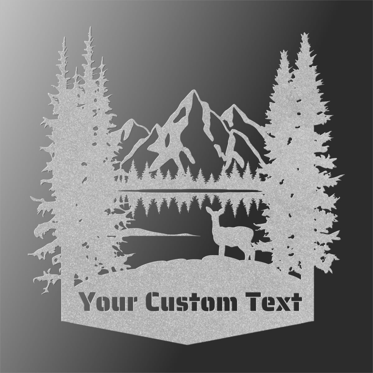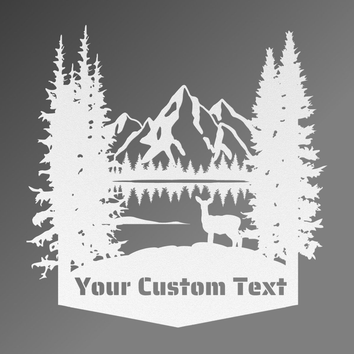 Custom Text Metal Sign With Deer, Trees, Mountain, Open Top Emblem
