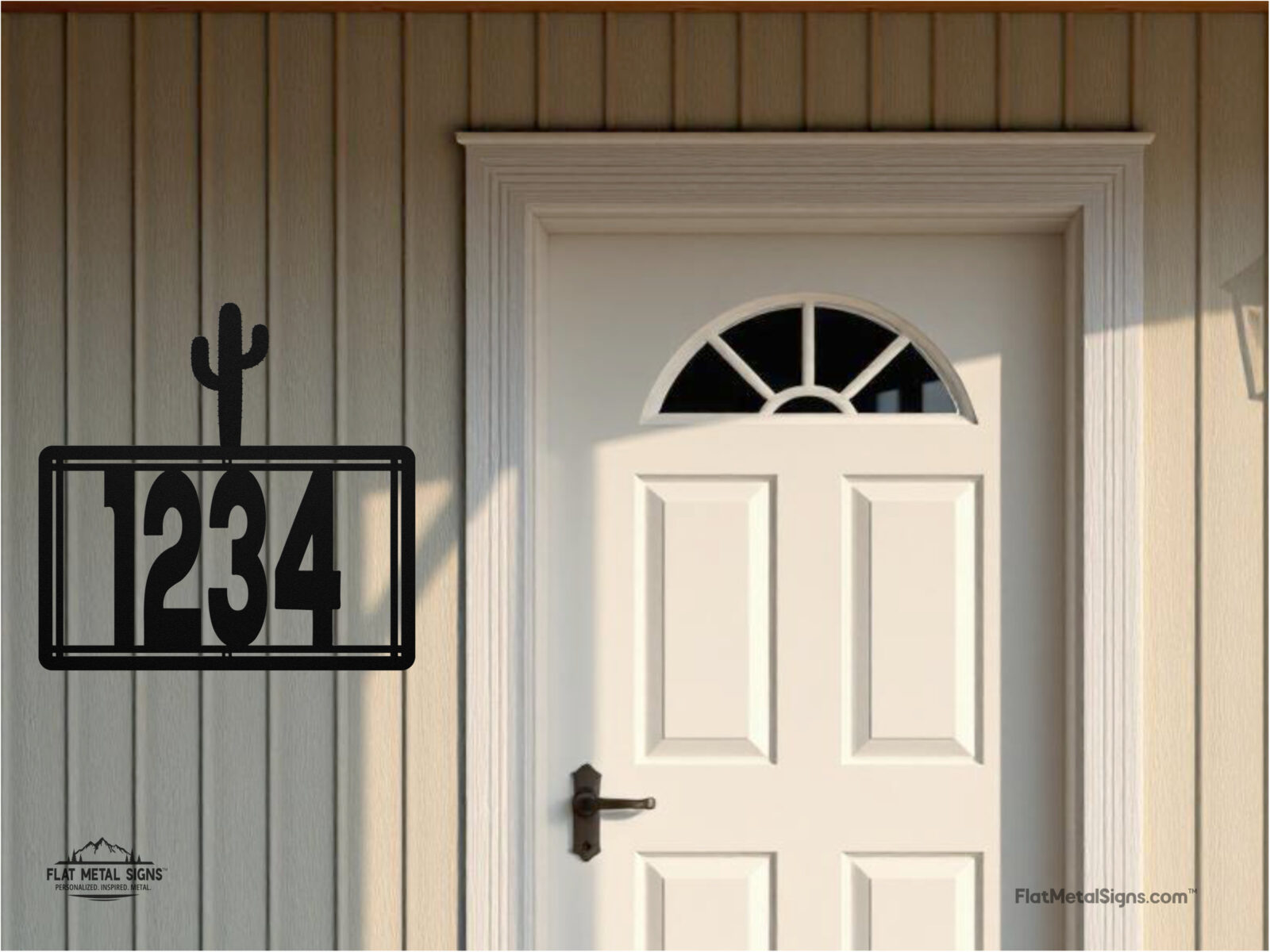 Personalized Metal House Number Sign with Cactus Accent crafted from 18-gauge steel with bold, easy-to-read numbers and durable powder coat finish.