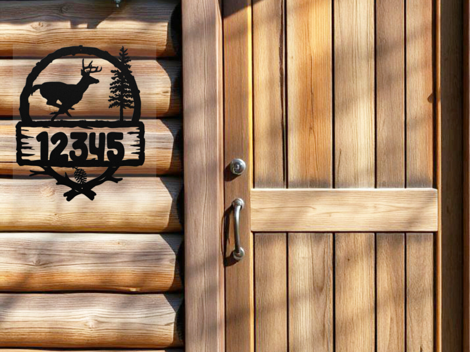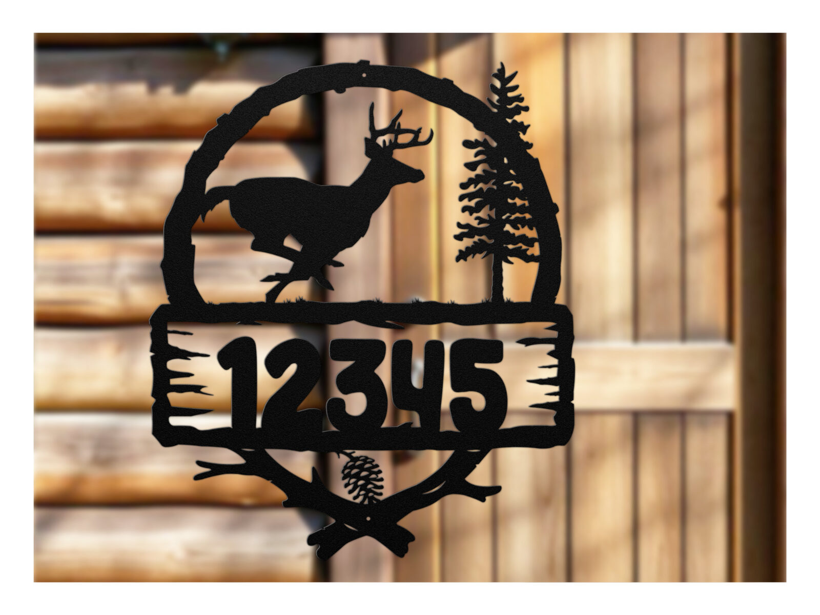 Precision cut from durable 18-gauge steel and finished with a weather-resistant powder coat, this running buck address metal sign is made for year-round outdoor display. Mounted near a driveway, gate, porch, or entryway, it adds a strong wildlife presence without feeling busy or overstated.
