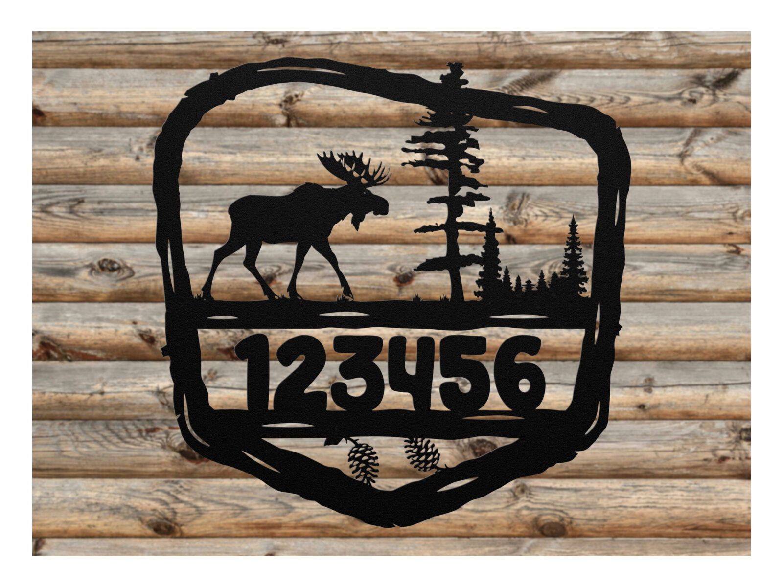 Walking moose park sign crafted in a rustic twig-frame style, bringing a calm northern woodland feel to your cabin or home. This handcrafted design features a moose silhouette stepping through the trees, framed by a natural twig-style border for an authentic park-sign look. Your personalized house number sits cleanly across the lower bar, keeping the walking moose park sign both functional and visually balanced for porch posts, entry walls, or driveway markers.